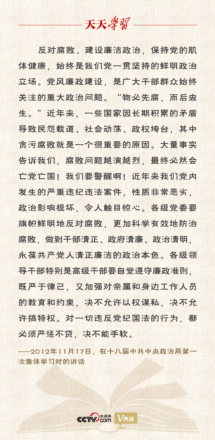 黨風(fēng)廉政建設(shè)永遠(yuǎn)在路上,反腐敗斗爭永遠(yuǎn)在路上。當(dāng)前,反腐敗斗爭雖然取得了壓倒性勝利并不斷鞏固發(fā)展,但形勢依然嚴(yán)峻復(fù)雜。腐敗問題具有頑固性、反復(fù)性、長期性,我們必須堅(jiān)持把反腐敗斗爭擺在極為重要的位置,才能經(jīng)受住“四大考驗(yàn)”、克服“四種危險(xiǎn)”。只要堅(jiān)持管黨治黨不放松、正風(fēng)肅紀(jì)不停步、反腐懲惡不手軟,我們就一定能夠跳出治亂興衰的歷史周期率,贏得這場輸不起也決不能輸?shù)恼味窢帲I(lǐng)和保障中國特色社會主義巨輪行穩(wěn)致遠(yuǎn)!