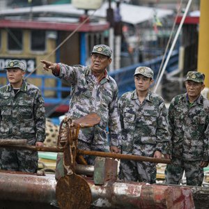 在海南省瓊海市潭門鎮(zhèn),潭門海上民兵連副連長王書茂(左二)在組織民兵開展訓練任務(2018年12月10日攝)。新華社發(fā)(宋國強 攝)