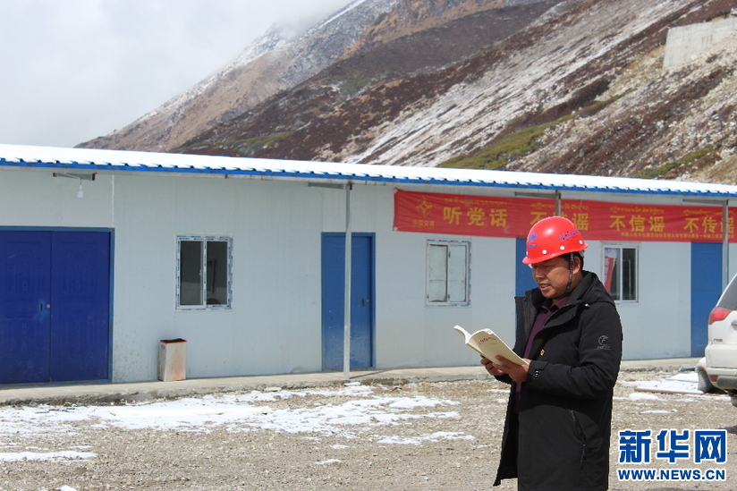 姚紅紀(jì)在拉康項(xiàng)目施工點(diǎn)為工人講黨課(4月24日攝)。新華網(wǎng)發(fā) (王雙雙攝)