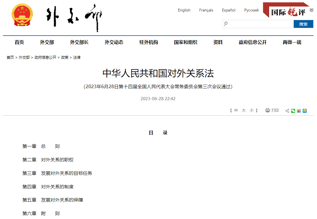 從7月1日起,《中華人民共和國對外關(guān)系法》正式施行。這是新中國首部基礎(chǔ)性、綱領(lǐng)性、綜合性對外關(guān)系法律,為中國與世界交往提供了更完善的法律遵循。它將讓世界更好地了解中國,了解中國推動構(gòu)建人類命運共同體的堅定信念,了解中國維護(hù)國家主權(quán)、安全和發(fā)展利益以及國際公平正義的決心和擔(dān)當(dāng)。新加坡《聯(lián)合早報》引述專家的話評價說,這部法律展現(xiàn)了中國外交政策原則,將中國執(zhí)政黨領(lǐng)導(dǎo)外交事務(wù)的論述以法律形式進(jìn)行了確立。