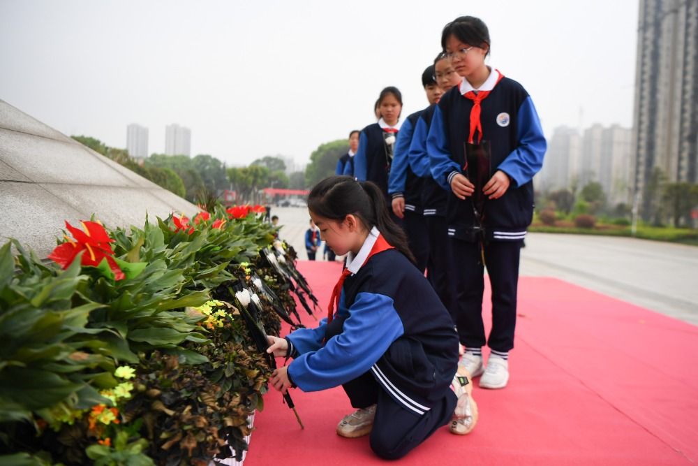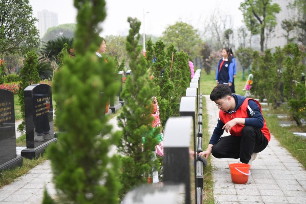 當(dāng)日,在湖南省長沙市,共青團長沙市天心區(qū)委員會、天心區(qū)青年志愿者協(xié)會組織學(xué)生、志愿者來到湖南革命陵園祭掃烈士墓,表達對烈士的深切緬懷之情。