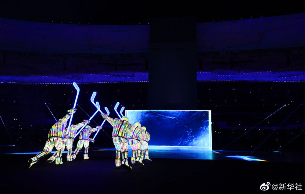 展示整個(gè)冬奧會(huì)的歷史。一方巨大的水從冰面中升起,凝固成冰。過往23屆冬奧舉辦城市的歷史,隨著環(huán)繞全場的24道“激光刻刀”的雕琢,閃回其上,最終定格為“2022中國北京”。