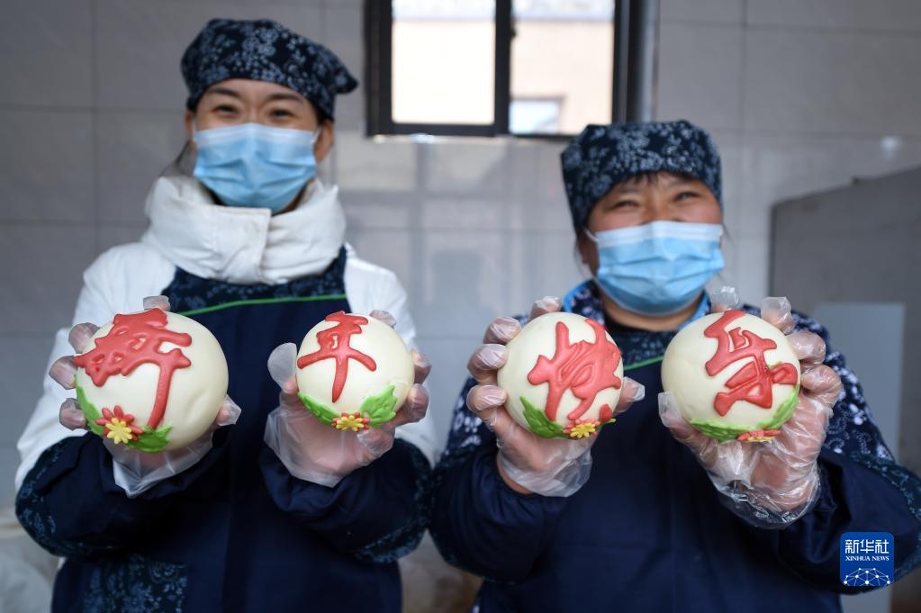 1月28日,在河北省平山縣西柏坡鎮(zhèn)北莊村團結食堂,工作人員展示制作的特色面食。新華社記者 駱學峰 攝