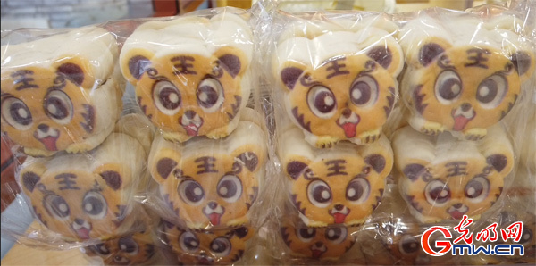 除了穿戴,食品中的“虎”元素也必不可少。在中華老字號(hào)北京稻香村,一款名為“大王餅”的糕點(diǎn)被擺在十分顯眼的位置?!按笸躏灐蓖庥^上看是一個(gè)呆萌可愛的老虎頭,內(nèi)有雞肉松餡兒?;⒛昙磳⒌絹?lái),“大王餅”頗受歡迎?!爸苣┛土髁看髸r(shí),每天可以賣掉四五百塊?!北本┑鞠愦?前門店)店員說(shuō)。