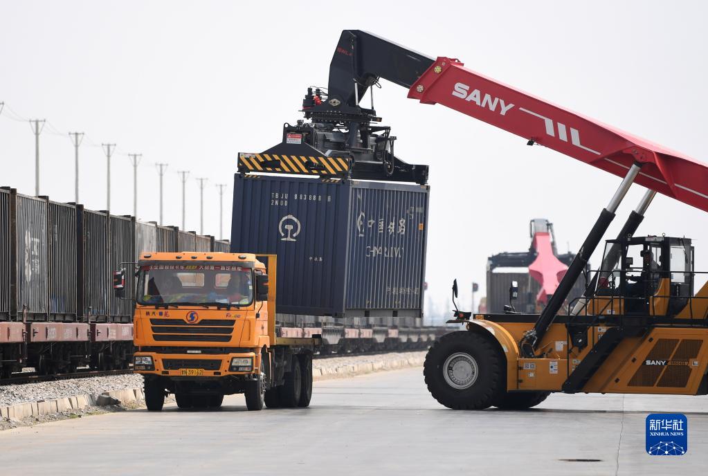 工作人員在蘭州新區(qū)中川北站物流園裝卸貨物(2022年8月11日攝)。新華社記者 陳斌 攝