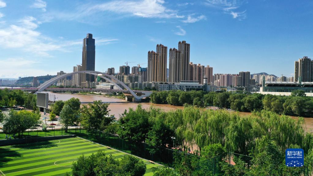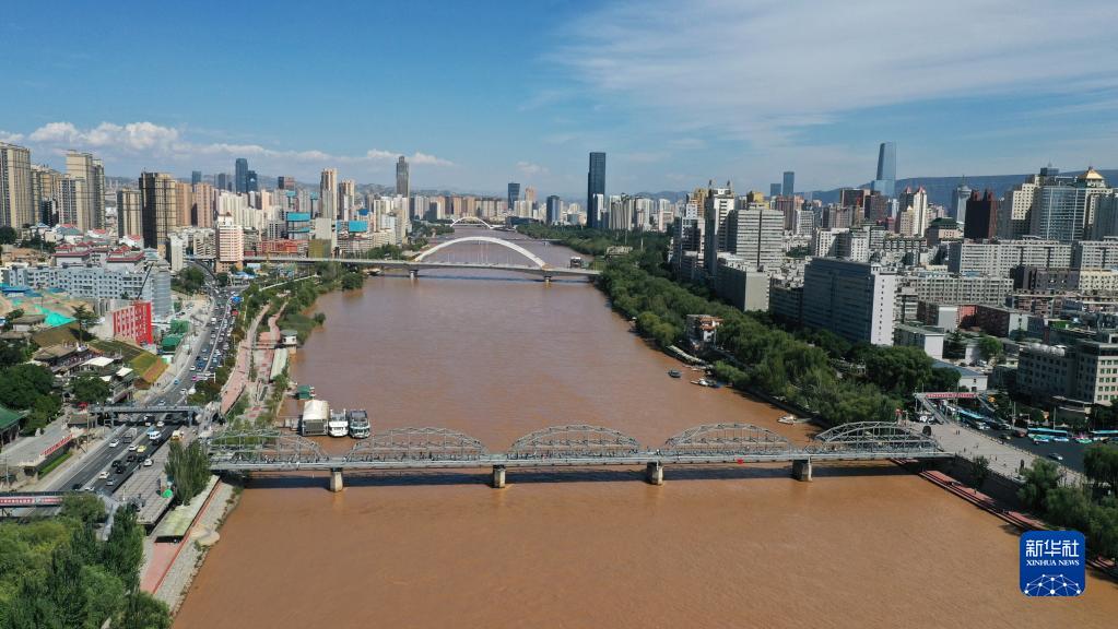 這是黃河蘭州段城市風(fēng)光(2022年9月5日攝,無(wú)人機(jī)照片)。新華社記者 陳斌 攝