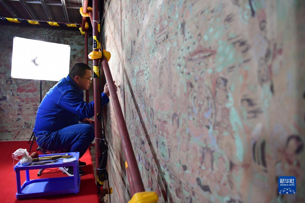 敦煌研究院文物保護(hù)技術(shù)服務(wù)中心壁畫修復(fù)師楊金禮在莫高窟第231窟內(nèi)修復(fù)出現(xiàn)病害的壁畫(2022年4月19日攝)。新華社記者 陳斌 攝
