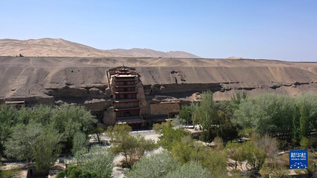 這是世界文化遺產(chǎn)莫高窟的標(biāo)志性建筑——第96窟窟外木構(gòu)建筑九層樓(2022年4月18日攝,無(wú)人機(jī)照片)。新華社記者 陳斌 攝