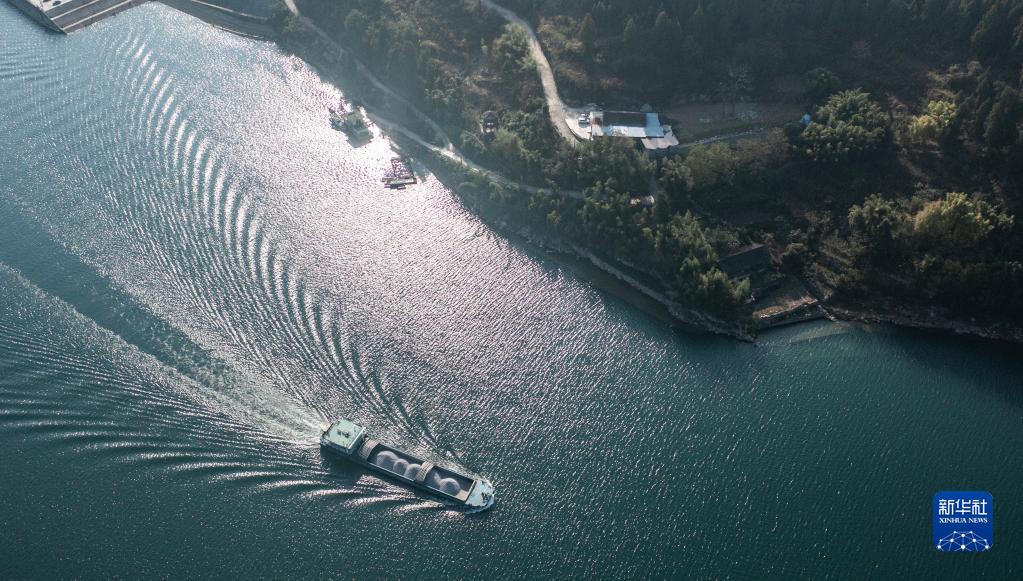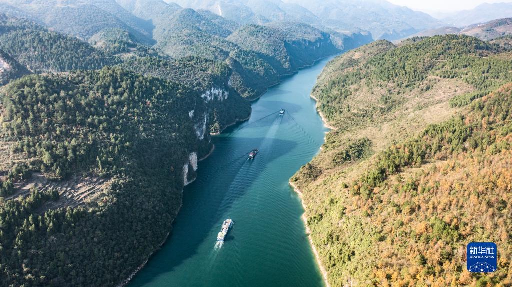 運(yùn)載磷礦石的貨船沿烏江航道順流航行(2021年11月18日攝,無人機(jī)照片)。新華社記者 陶亮 攝