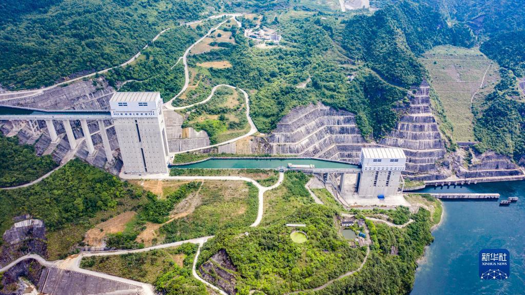 2021年6月投入試運(yùn)行的構(gòu)皮灘水電站配套的通航工程,被視為貴州通江達(dá)海的關(guān)鍵。構(gòu)皮灘通航水頭高差達(dá)199米,采用三級(jí)垂直升船機(jī)運(yùn)行,船只通過烏江構(gòu)皮灘水電站都要搭乘“水上電梯”,呈現(xiàn)出“水在空中懸,船在天上行”的奇景。