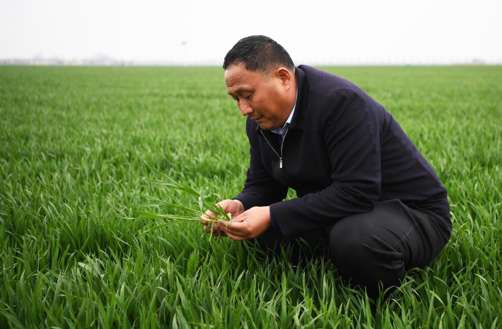 3月22日,種糧大戶劉天華在商水縣高標(biāo)準(zhǔn)農(nóng)田示范區(qū)查看自家小麥長勢。新華社記者 張浩然 攝
