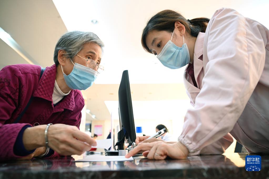 福建省三明市第一醫(yī)院的醫(yī)保辦工作人員(右)向前來咨詢藥品報(bào)銷問題的居民講解相關(guān)政策(2020年11月18日攝)。 新華社記者 姜克紅 攝