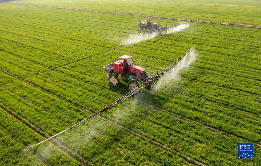 2022年3月9日,在江蘇省海安市大公鎮(zhèn)賁集村,村民駕駛植保機(jī)械在小麥田間進(jìn)行噴灑藥物作業(yè)(無人機(jī)照片)。 新華社發(fā)(翟慧勇 攝)