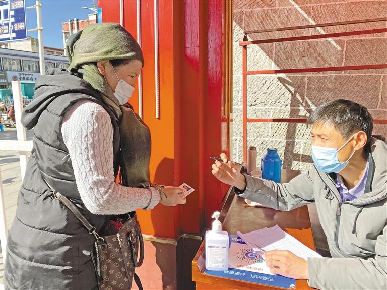 八廓商城市場(chǎng)部部長(zhǎng)卓嘎介紹說(shuō):“為廣大市民提供一個(gè)安全、祥和的購(gòu)物環(huán)境,我們?cè)谏虉?chǎng)設(shè)有5個(gè)進(jìn)出口,每個(gè)進(jìn)出口都需掃行程碼、測(cè)量體溫后才可進(jìn)入。因?yàn)橛行├先藳](méi)有智能手機(jī),無(wú)法掃健康瑪,我們會(huì)登記姓名、身份證號(hào)、聯(lián)系方式。并且在增加的攤位旁增設(shè)消防器材,不定時(shí)巡邏?!?/p>
