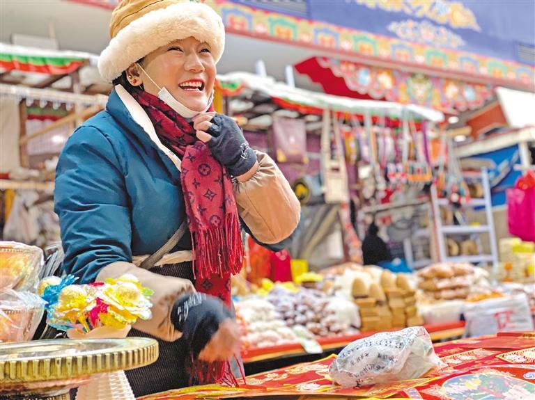 走出八廓商城,熙熙攘攘的人群中,大家眉眼帶笑,手上都拎著各式年貨,喜慶歡欣的氛圍充溢在大街小巷。藏歷新年的腳步越來(lái)越近了,古城年味日益濃。
