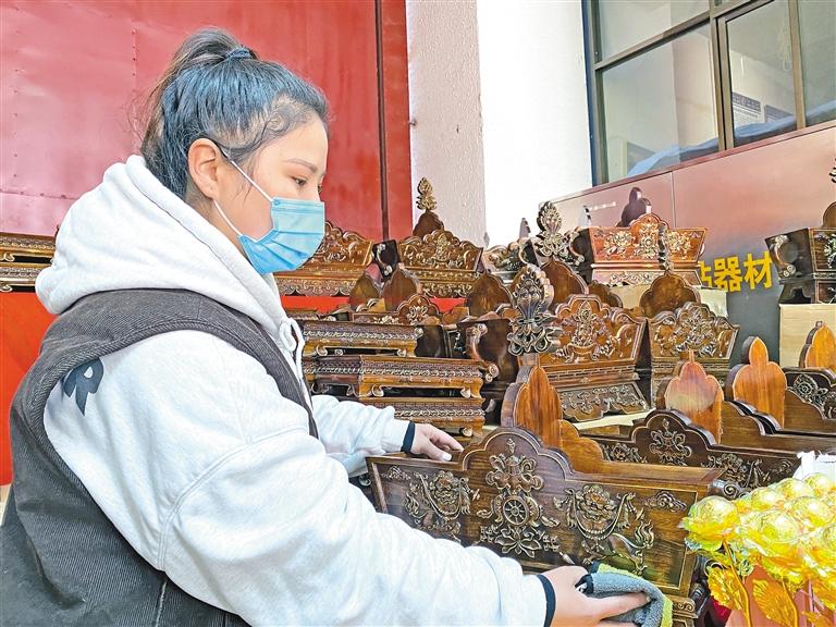 來(lái)自山南市貢嘎縣的拉吉帶著自家生產(chǎn)的“切瑪盒”第2次來(lái)到八廓商城年貨市場(chǎng)。“由于是自家生產(chǎn),所以我們自主設(shè)計(jì)了一款線條稍微簡(jiǎn)約的‘切瑪盒’;還有一款傳統(tǒng)線條與圖案的‘切瑪盒’。在顏色上,我們選擇了較為持重的深色,這樣的顏色大氣沉穩(wěn),許多市民非常喜歡,兩款售價(jià)都是380元。”拉吉介紹道。