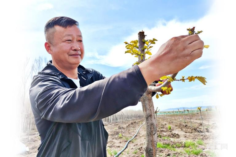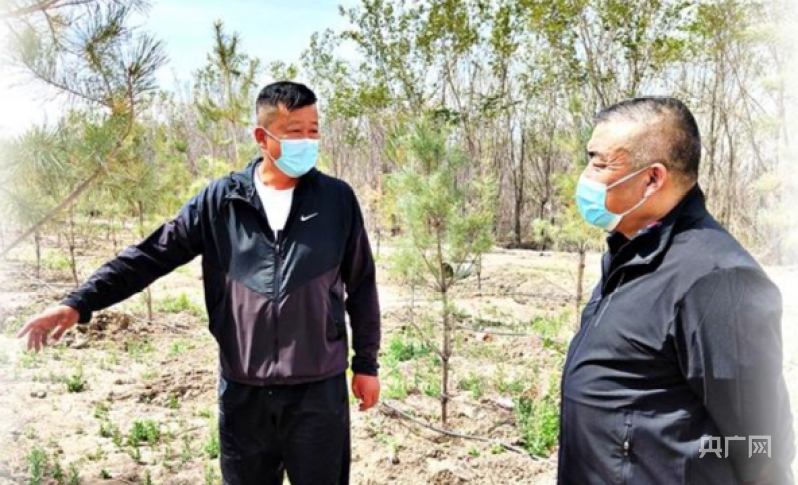 余磊在苗木基地察看苗木長(zhǎng)勢(shì)情況。(央廣網(wǎng)發(fā) 阿依加瑪麗·列提甫 攝)