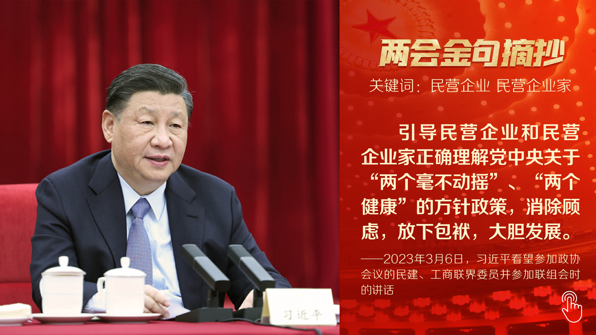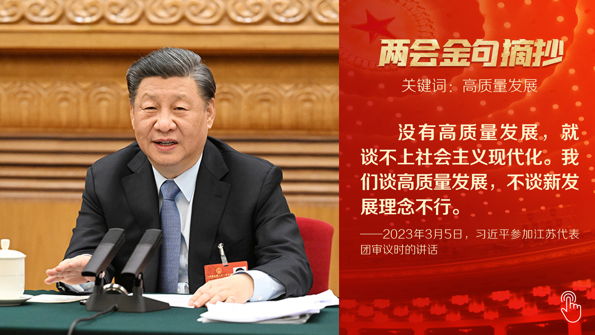 “高質(zhì)量發(fā)展是全面建設(shè)社會主義現(xiàn)代化國家的首要任務(wù)?!苯衲陜蓵状蔚綀F組,總書記以高質(zhì)量發(fā)展為題,詳細闡述中國未來施政發(fā)力點。第二天參加民建、工商聯(lián)界委員聯(lián)組會,他又就正確引導(dǎo)民營經(jīng)濟健康發(fā)展、高質(zhì)量發(fā)展作出重要論述,一句“要堅守主業(yè)、做強實業(yè),自覺走高質(zhì)量發(fā)展路子”為全國4700多萬家民營企業(yè)指明方向。十四屆全國人大一次會議閉幕會上,總書記再次向世界宣示:在強國建設(shè)、民族復(fù)興的新征程,我們要堅定不移推動高質(zhì)量發(fā)展。
