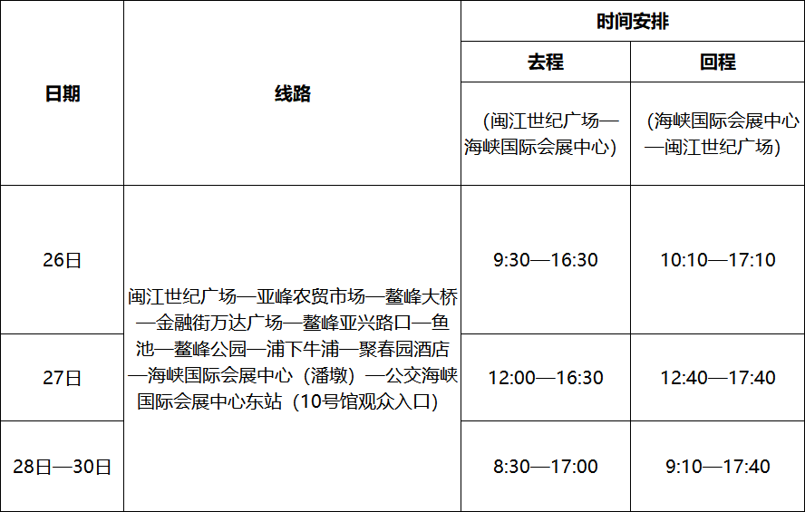 (1)可乘坐白湖亭——海峽國(guó)際會(huì)展中心區(qū)間專(zhuān)線,從白湖亭站出發(fā)直達(dá)海峽國(guó)際會(huì)展中心(1號(hào)館)。