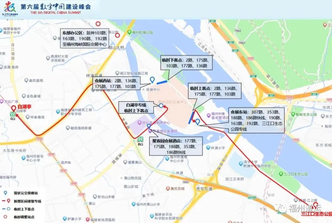 (2)可乘坐三江口生態(tài)公園——公交海峽國(guó)際會(huì)展中心東站區(qū)間專(zhuān)線,從三江口生態(tài)公園出發(fā)沿著南江濱東大道、浦下洲路、會(huì)展東路至公交海峽國(guó)際會(huì)展中心東站。
