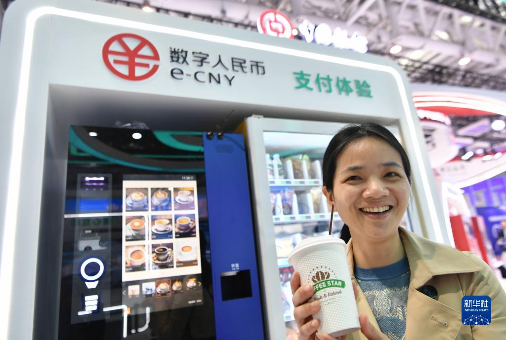 4月26日,在第六屆數(shù)字中國建設成果展覽會現(xiàn)場,一名觀眾展示用數(shù)字人民幣購買的咖啡。新華社記者 魏培全 攝