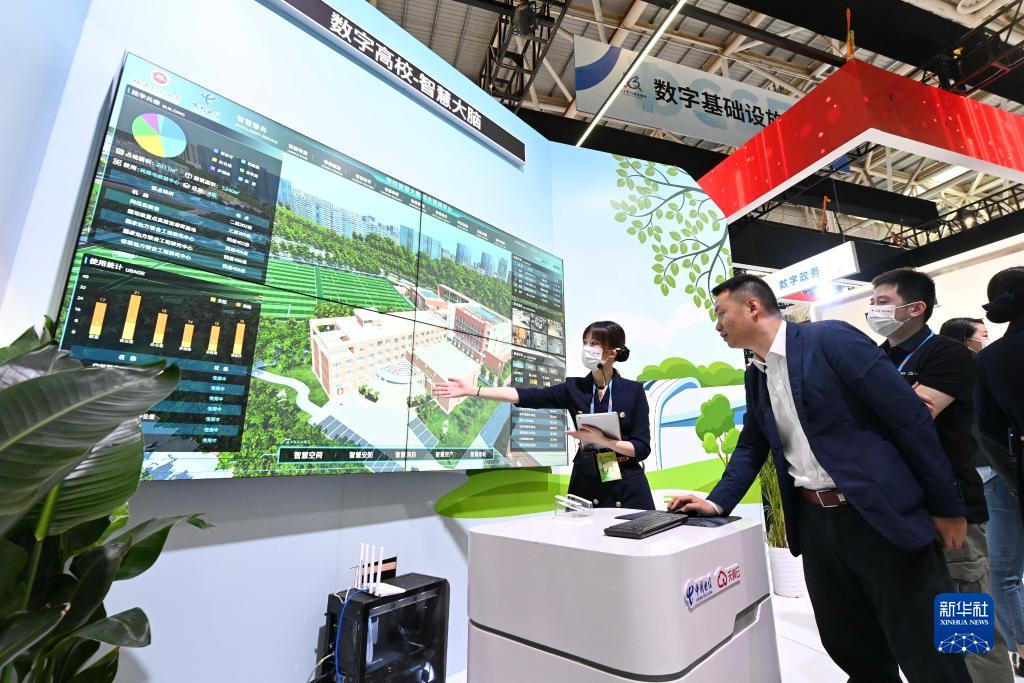 4月26日,數(shù)字福建建設成果專區(qū)工作人員在展覽現(xiàn)場向參觀者介紹數(shù)字高校智慧大腦綜合管理平臺,該平臺由福建師范大學和中國電信福州分公司聯(lián)手打造。新華社記者 林善傳 攝