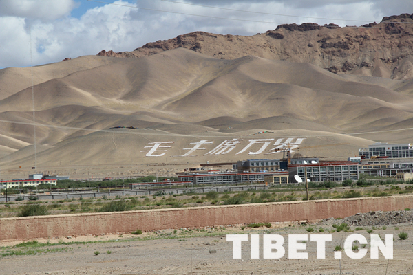 中國西藏網(wǎng)訊 進入阿里地區(qū)首府噶爾縣獅泉河鎮(zhèn)時,獅泉河城北山坡上“毛主席萬歲”五個巨字格外醒目,當(dāng)?shù)厝擞H切地稱之為“萬歲山”。