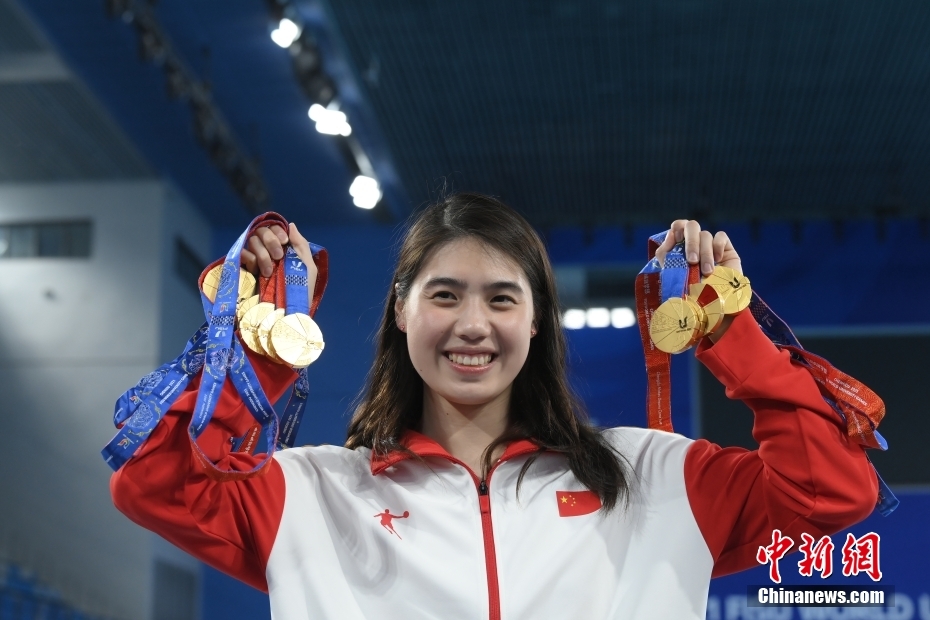 8月7日,第31屆世界大學(xué)生夏季運(yùn)動(dòng)會(huì)游泳項(xiàng)目比賽在四川成都全部結(jié)束后,張雨霏展示其在本屆大運(yùn)會(huì)獲得的9枚金牌。成都大運(yùn)會(huì)上,張雨霏獲得女子50米蝶泳、女子100米自由泳、女子100米蝶泳、女子50米自由泳、男女混合4×100米混合泳接力、男女混合4×100米自由泳接力、女子4×100米自由泳接力、女子4×100米混合泳接力、女子4×200米自由泳接力9項(xiàng)冠軍。