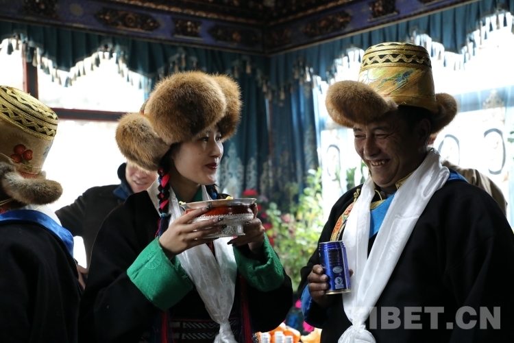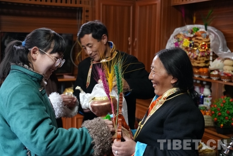 天亮以后,扎西江村一家人穿上新衣服,輪流敬切瑪、喝青稞酒,互道“扎西德勒”。扎西江村家的小女兒達(dá)娃倉(cāng)決吃切瑪?shù)臅r(shí)候,先用拇指和食指抓起一小撮糌粑灑向空中3次,表示敬天地,然后把糌粑放進(jìn)自己嘴里。喝青稞酒也同樣如此,要先用雙手接過(guò)酒杯,然后左手拿杯,右手無(wú)名指輕輕地在杯中蘸酒,彈向空中,如此反復(fù)三次。