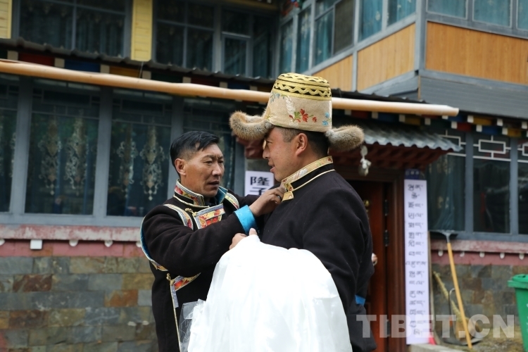 圖為洛桑扎西正在為丹增赤列整理著裝 攝影:呂靜