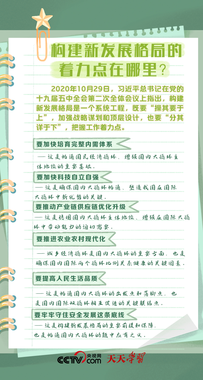 天天學習構(gòu)建以國內(nèi)大循環(huán)為主體、國內(nèi)國際雙循環(huán)相互促進的新發(fā)展格局,是根據(jù)我國發(fā)展階段、環(huán)境、條件變化,特別是基于我國比較優(yōu)勢變化,審時度勢作出的重大決策。構(gòu)建新發(fā)展格局是事關(guān)全局的系統(tǒng)性、深層次變革,是立足當前、著眼長遠的戰(zhàn)略謀劃。