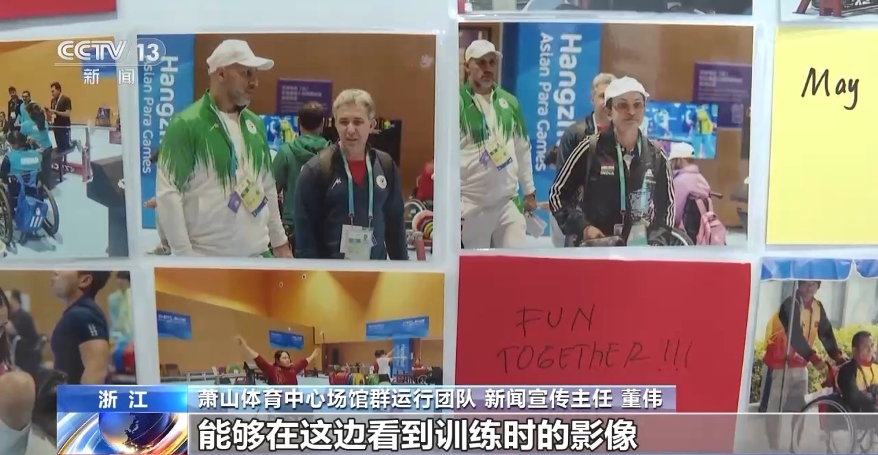杭州蕭山體育中心體育館,是杭州第4屆亞殘運會舉重項目的比賽場館,10月23日,舉重項目已經(jīng)在這里正式開賽。場館的工作人員為了給運動員放松心情,并鼓勵他們比賽,特意制作了一面照片墻。