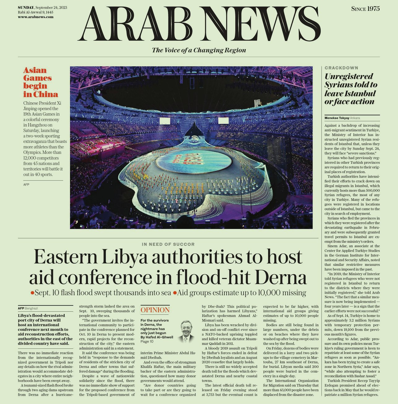 沙特阿拉伯24日出版的《阿拉伯新聞報》(Arab News)以頭版圖文的方式呈現(xiàn)亞運會開幕盛況,用了“五彩斑斕”來形容這一場開幕式,并介紹本屆亞運會的運動員人數(shù)甚至超過了奧運會,來自45個國家和地區(qū)超過12000名運動員將在40個運動大項中展開角逐。