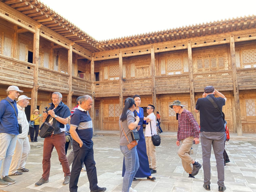 中午,調(diào)研組在黃南藏族自治州尖扎縣噶達(dá)莊園品嘗了藏族美食??勺匪莅倌隁v史的噶達(dá)莊園是當(dāng)?shù)毓爬藗}(cāng)活佛的故居后花園,園內(nèi)樹(shù)木茂密、鳥(niǎo)語(yǔ)花香,海外學(xué)者們紛紛表示,在這個(gè)充滿歷史文化氛圍的莊園用餐是一次難忘的體驗(yàn)。下午,調(diào)研組一行參觀了尖扎縣昂拉鄉(xiāng)昂拉千戶府和昂拉賽康寺。昂拉千戶府始建于清代,1941年重建,1949年竣工。莊園占地面積約4600平方米,是青海省保留比較完整的藏式莊園。該莊院建筑風(fēng)格獨(dú)特,前院用木質(zhì)結(jié)構(gòu)建造,后院用土木結(jié)構(gòu)建造,其整體建筑風(fēng)格采用了漢式山水元素。