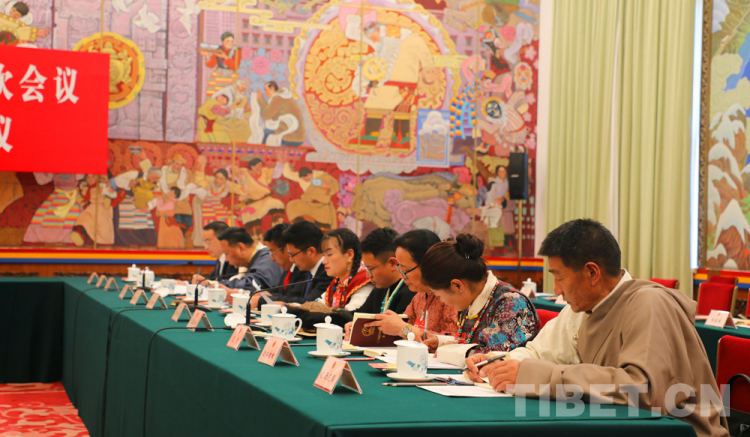 圖為扎西江村(右四)參加十四屆全國(guó)人大二次會(huì)議西藏代表團(tuán)開(kāi)放團(tuán)組會(huì)議 攝影:桑吉
