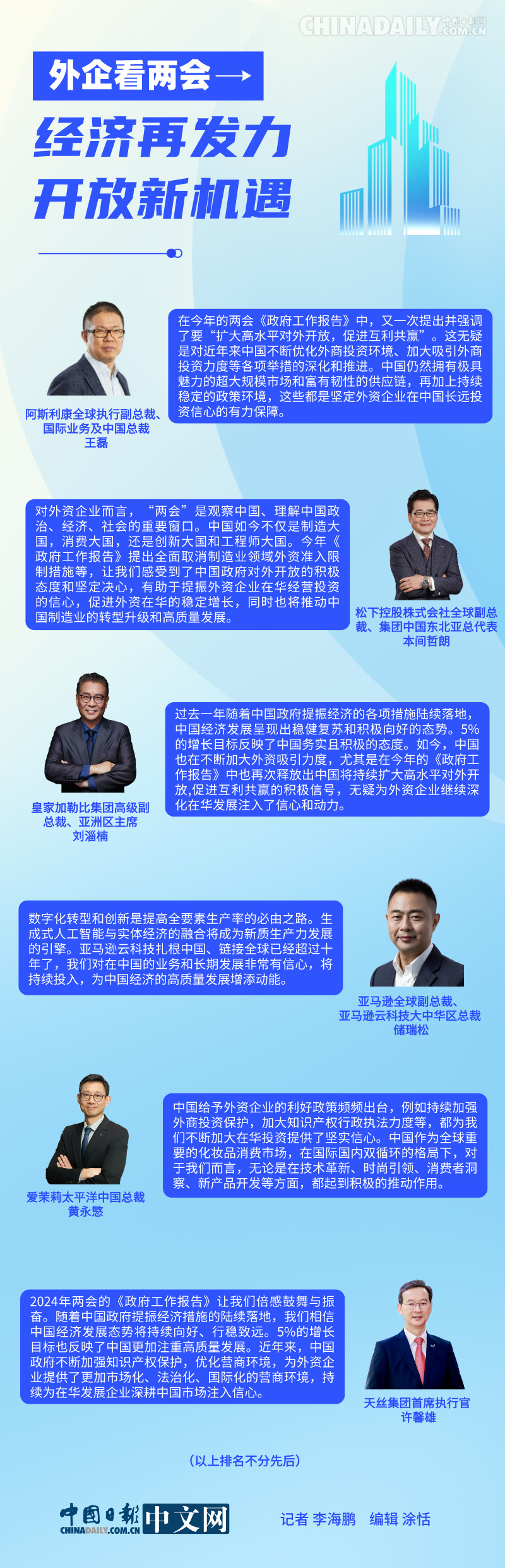 “中國是贏得未來的重要引擎”、“5%的經(jīng)濟增長目標反映了中國理性務(wù)實的發(fā)展態(tài)度,同時也反映了中國更加注重高質(zhì)量發(fā)展”、 “《政府工作報告》中再次釋放出中國將持續(xù)擴大高水平對外開放、促進互利共贏的積極信號,為外資企業(yè)繼續(xù)深化在華發(fā)展注入了信心和動力”、“與中國‘脫鉤’是不現(xiàn)實的,在經(jīng)濟全球化時代,各國深化合作才能讓經(jīng)濟可持續(xù)發(fā)展”……眾多外企紛紛表示,中國經(jīng)濟的穩(wěn)定發(fā)展將會繼續(xù)為外資企業(yè)提供廣闊的空間和豐富的機遇,于此同時,他們也將持續(xù)投入、加碼中國市場,為中國經(jīng)濟高質(zhì)量發(fā)展提供動力。