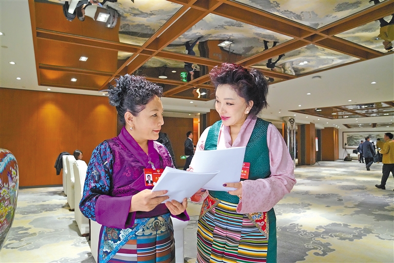3月5日,全國政協(xié)十四屆二次會議分界別討論政協(xié)常委會工作報告和提案工作情況報告,住藏全國政協(xié)委員緊緊圍繞兩個報告,結(jié)合西藏政協(xié)工作實際,在小組討論中積極履職建言。圖為住藏全國政協(xié)委員卓嘎(左)和朗杰拉措(右)在會議結(jié)束后討論交流。