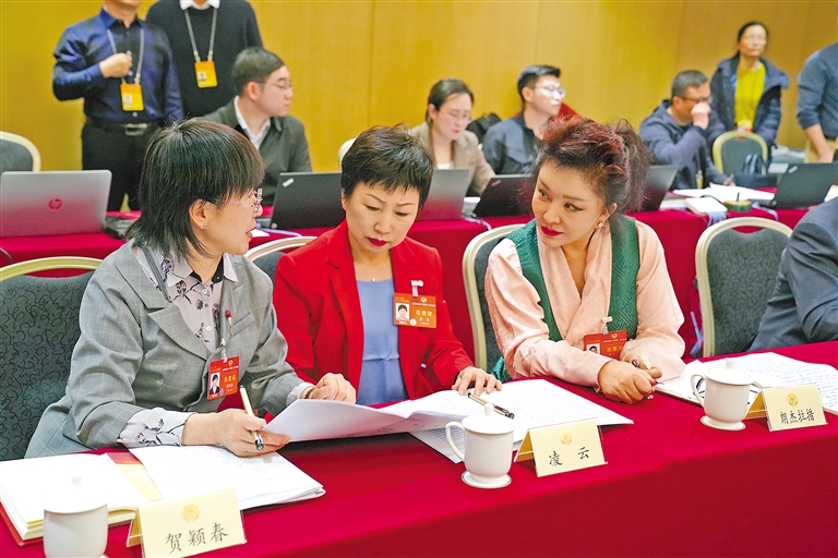 3月5日,全國政協(xié)十四屆二次會議分界別討論政協(xié)常委會工作報告和提案工作情況報告,住藏全國政協(xié)委員緊緊圍繞兩個報告,結(jié)合西藏政協(xié)工作實際,在小組討論中積極履職建言。圖為住藏全國政協(xié)委員朗杰拉措(右)在會議開始前與參會的其他委員討論交流。記者 張思雨 旦增旺姆 攝
