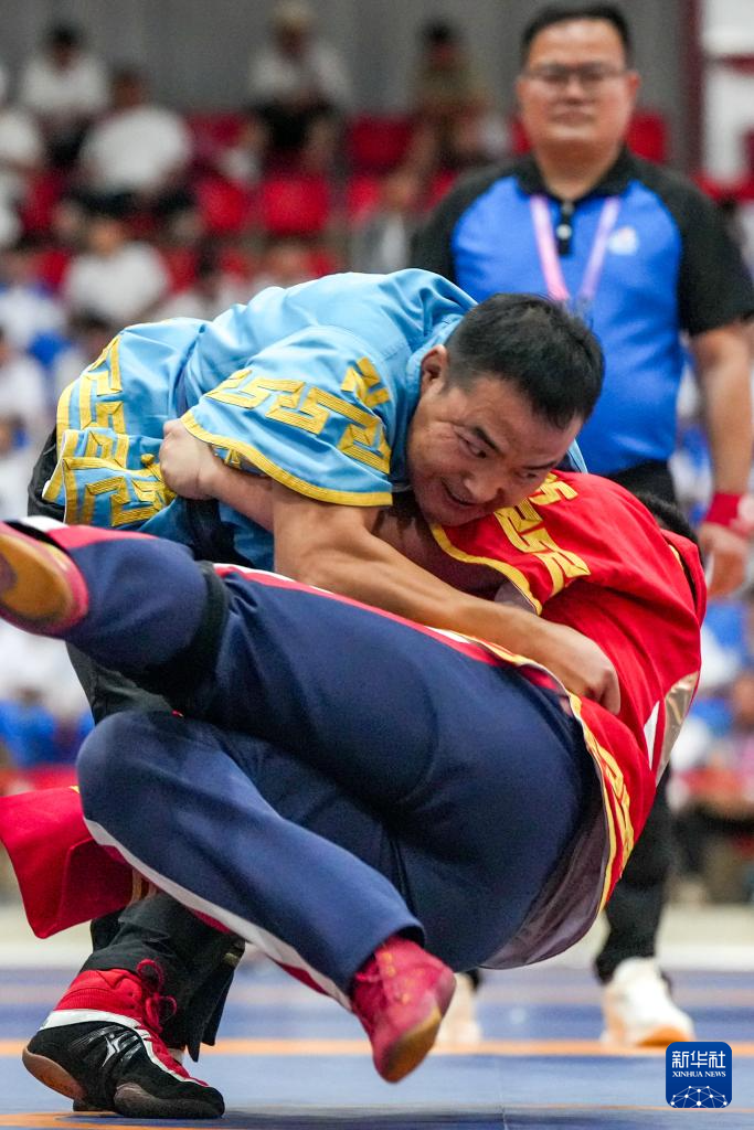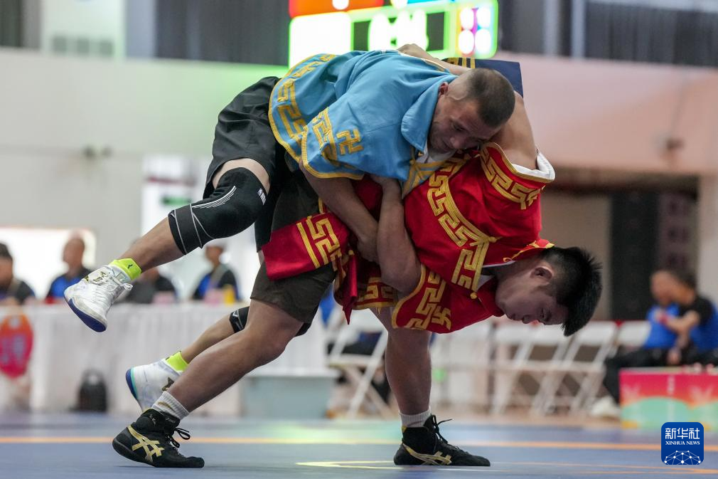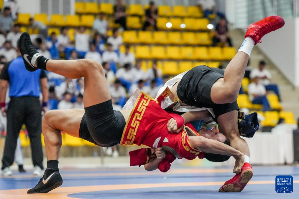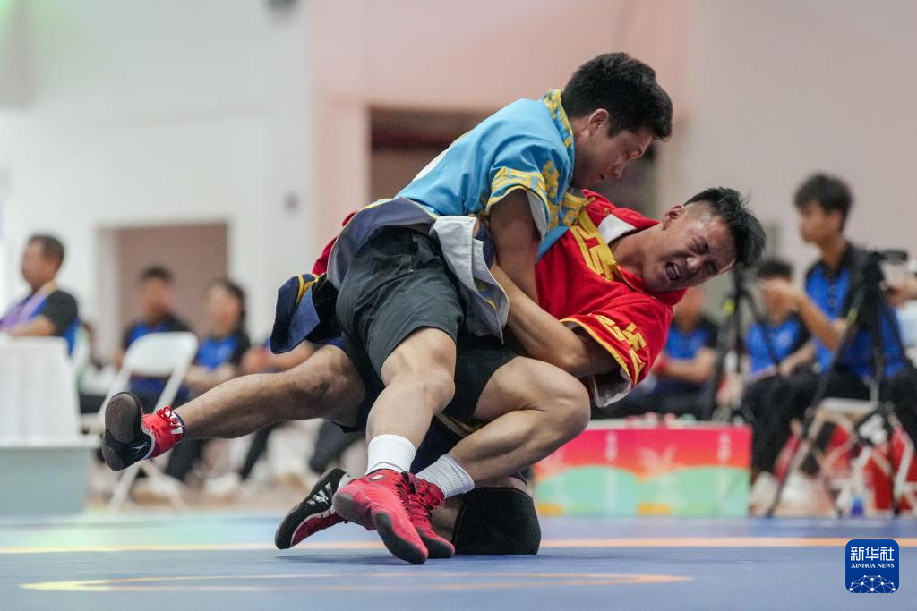當(dāng)日,第十二屆全國(guó)少數(shù)民族傳統(tǒng)體育運(yùn)動(dòng)會(huì)民族式摔跤北嘎淘汰賽第一輪比賽在海南省三亞市舉行。