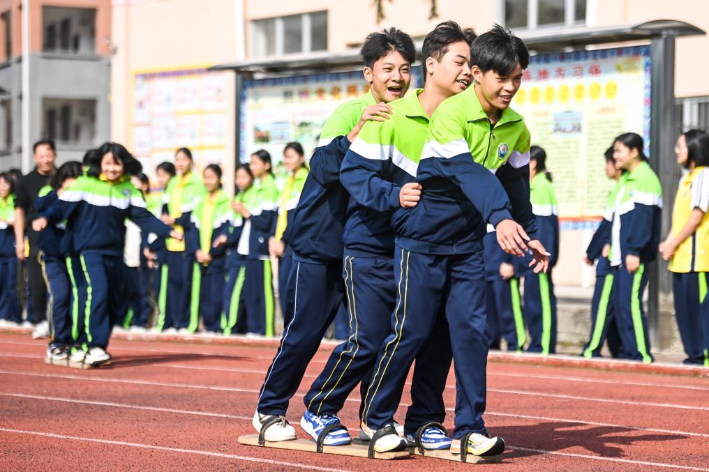 11月6日,廣西玉林市民族中學(xué)的學(xué)生們在進(jìn)行板鞋競速比賽