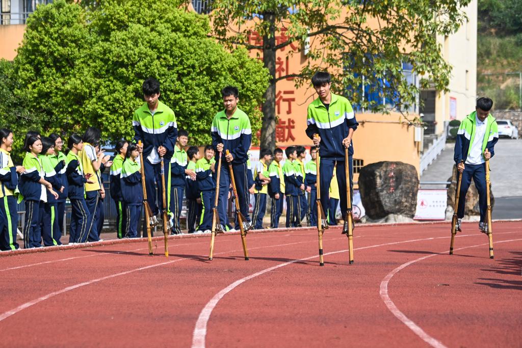 11月6日,廣西玉林市民族中學(xué)的學(xué)生們在進(jìn)行高腳競速比賽