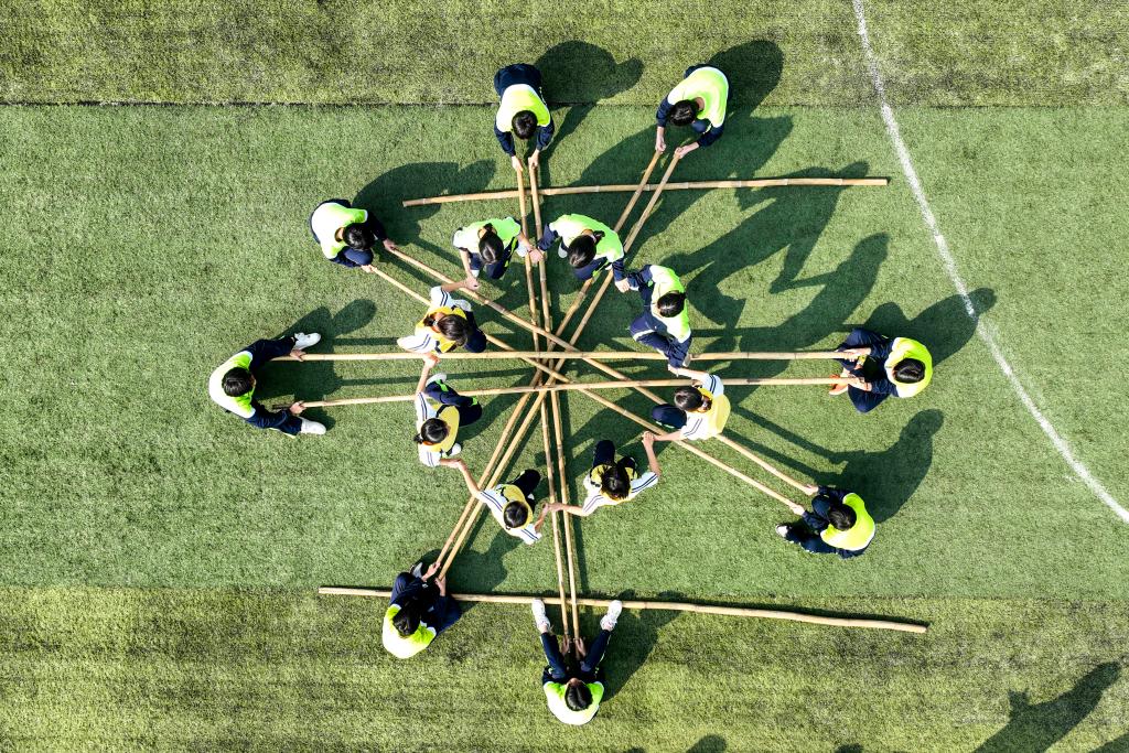11月6日,廣西玉林市民族中學(xué)的學(xué)生們在跳竹竿舞(無人機(jī)照片)