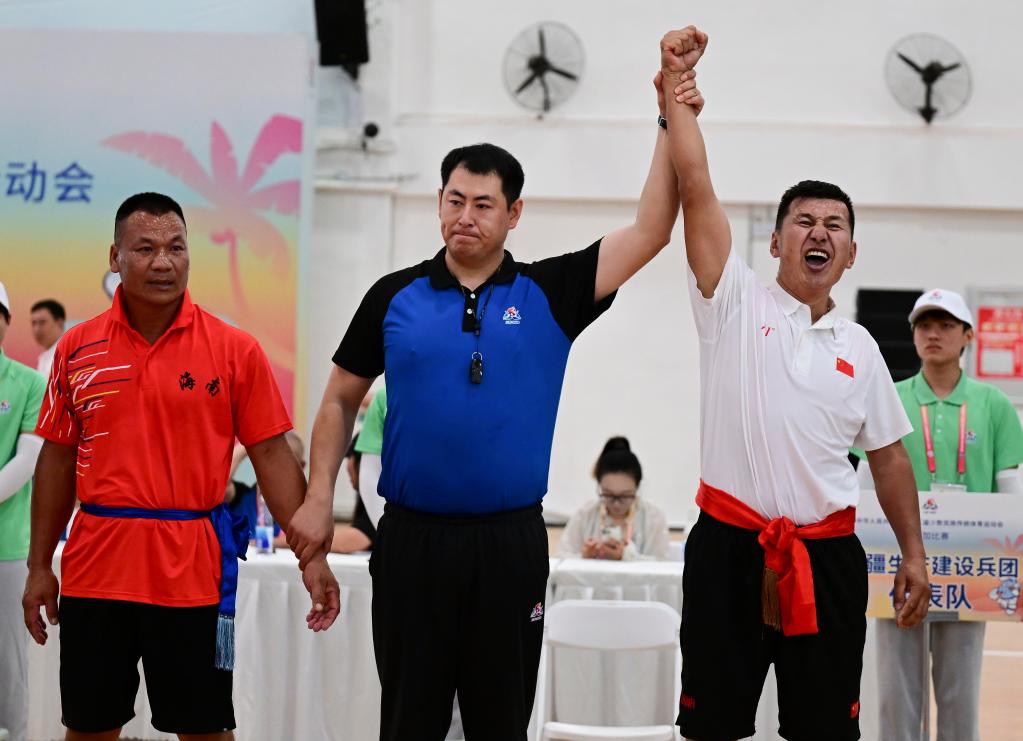 27日,第十二屆全國少數(shù)民族傳統(tǒng)體育運(yùn)動會(以下簡稱“運(yùn)動會”)押加比賽迎來五個組別的最終爭奪。新疆生產(chǎn)建設(shè)兵團(tuán)選手提亞那克驚險(xiǎn)取勝,獲得85公斤級一等獎。一場鏖戰(zhàn)后,他與來自海南的選手吉航敬擁抱致意。