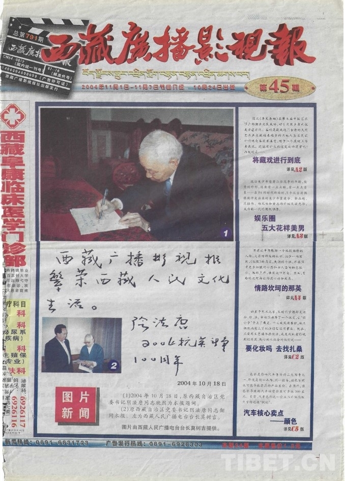 圖為載有陰書記題詞的《西藏廣播影視報》