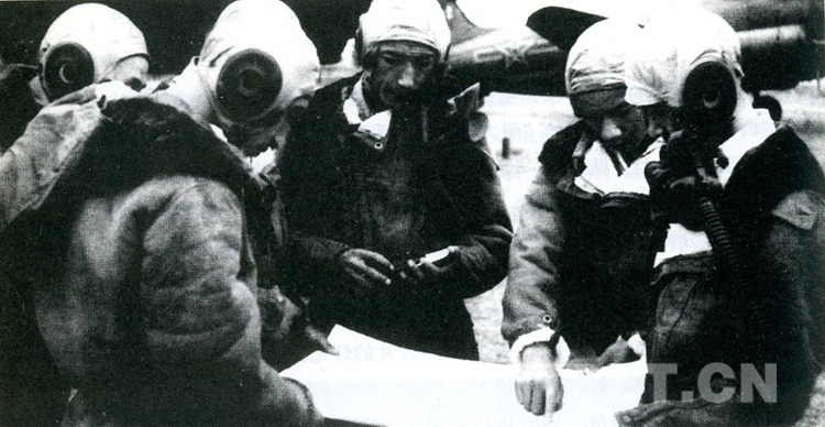 圖為1950年,進(jìn)藏部隊(duì)供應(yīng)十分困難??哲姾竭\(yùn)大隊(duì)接受了向進(jìn)藏部隊(duì)空投食物的命令。圖為飛行員在研究康定、甘孜空投的航線。