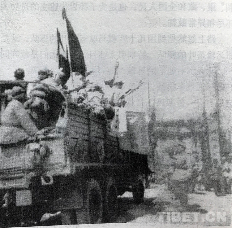 魏克在日記中寫道:“滿載著進(jìn)軍英雄們的車隊(duì),被沿途歡送的人群包圍起來了,許多青年男女跑上來,在汽車上貼滿了紅綠標(biāo)語,送上一碗碗茶水,將一把把香煙撒在車廂上,鮮花、紙花、小旗子插滿了車的四周?!D銈兤扉_得勝,馬到成功’和‘迅速解放西藏人民’的口號(hào)聲此起彼伏、響徹云霄。汽車慢慢地從一個(gè)個(gè)彩門下通過,被歡呼的群眾送了一程又一程。”