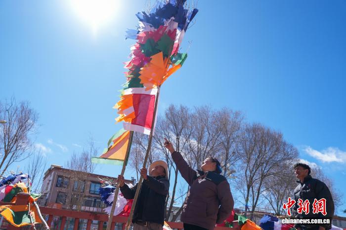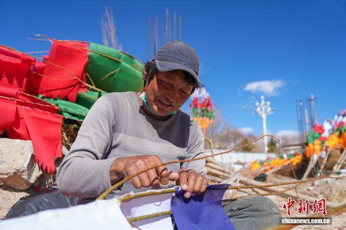 2月5日,臨近藏歷新年,在西藏自治區(qū)拉薩市街頭,農(nóng)牧民正縫制五彩經(jīng)幡樹。五彩經(jīng)幡樹是藏族民眾在藏歷新年前必備的年貨之一。藏歷新年期間,藏族民眾會選擇一個(gè)良辰吉日,為自家的房頂更換五彩經(jīng)幡樹,祈求新的一年里五谷豐登,吉祥如意。