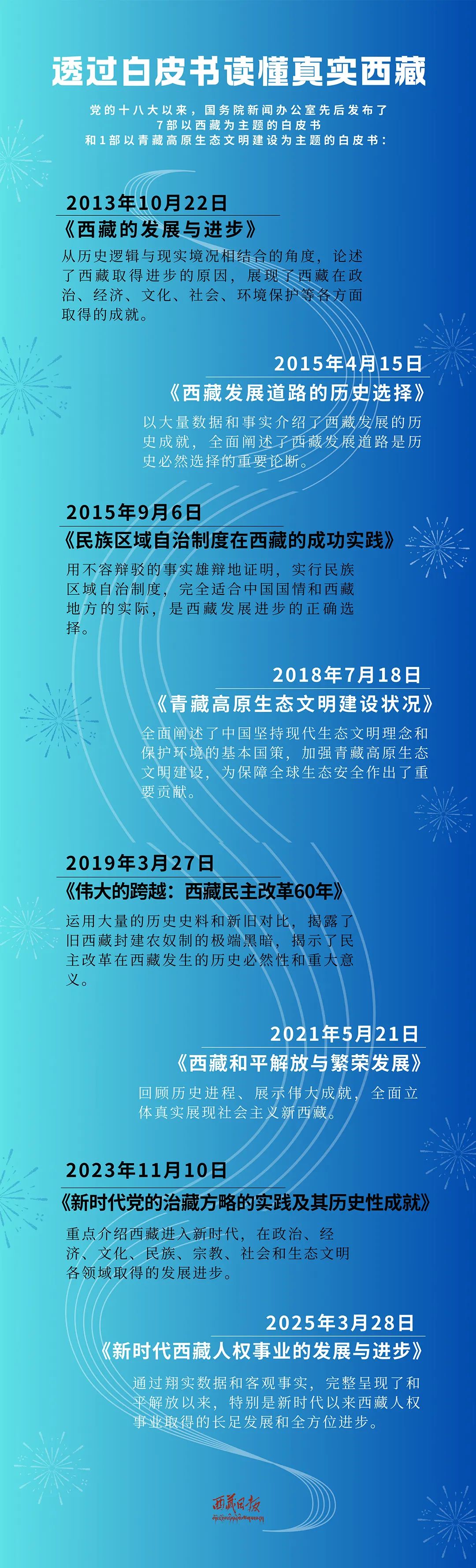 3月28日,國務(wù)院新聞辦公室發(fā)布《新時代西藏人權(quán)事業(yè)的發(fā)展與進(jìn)步》白皮書。這也是黨的十八大以來,國務(wù)院新聞辦公室發(fā)布的以西藏為主題的第七部白皮書。這些白皮書涉及西藏經(jīng)濟(jì)社會發(fā)展的各方面,真實地展現(xiàn)了西藏步入發(fā)展最好、變化最大、群眾得實惠最多的新時代,各項事業(yè)取得的全方位進(jìn)步、歷史性成就。