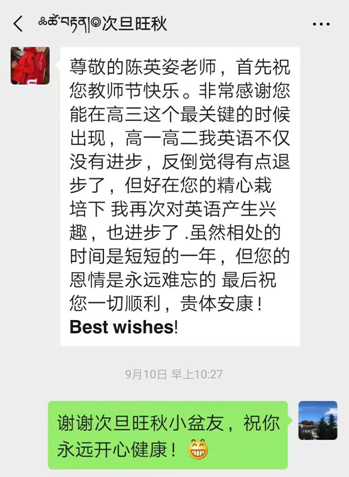 圖為次旦旺秋發(fā)給陳英姿老師的微信截圖