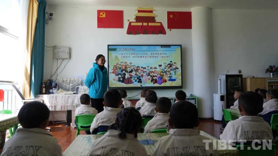 在西藏日喀則市拉孜縣第二幼兒園(1)班教室里,老師郁瓊珠姆話音剛落,孩子們的回答便齊聲響起,清脆而堅定。屏幕上,56個民族的卡通形象匯聚于一幅畫之中。她接著問道:“那我們國家遼闊的土地上,生活著多少個民族?”一只只小手高高舉起,搶答聲此起彼伏:“56個!”對孩子們而言,這些答案已經(jīng)成為日常學(xué)習(xí)生活中耳濡目染的常識。